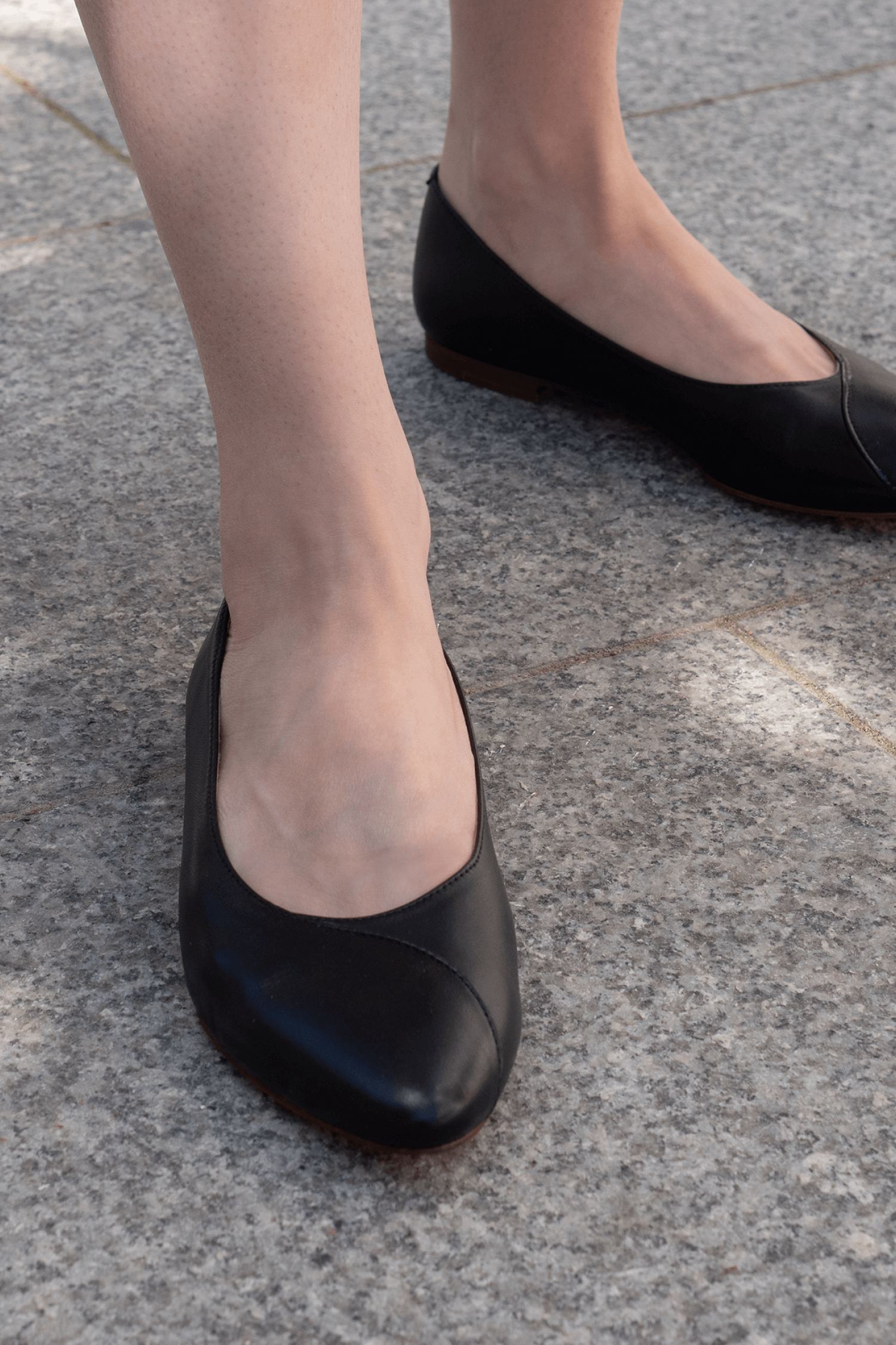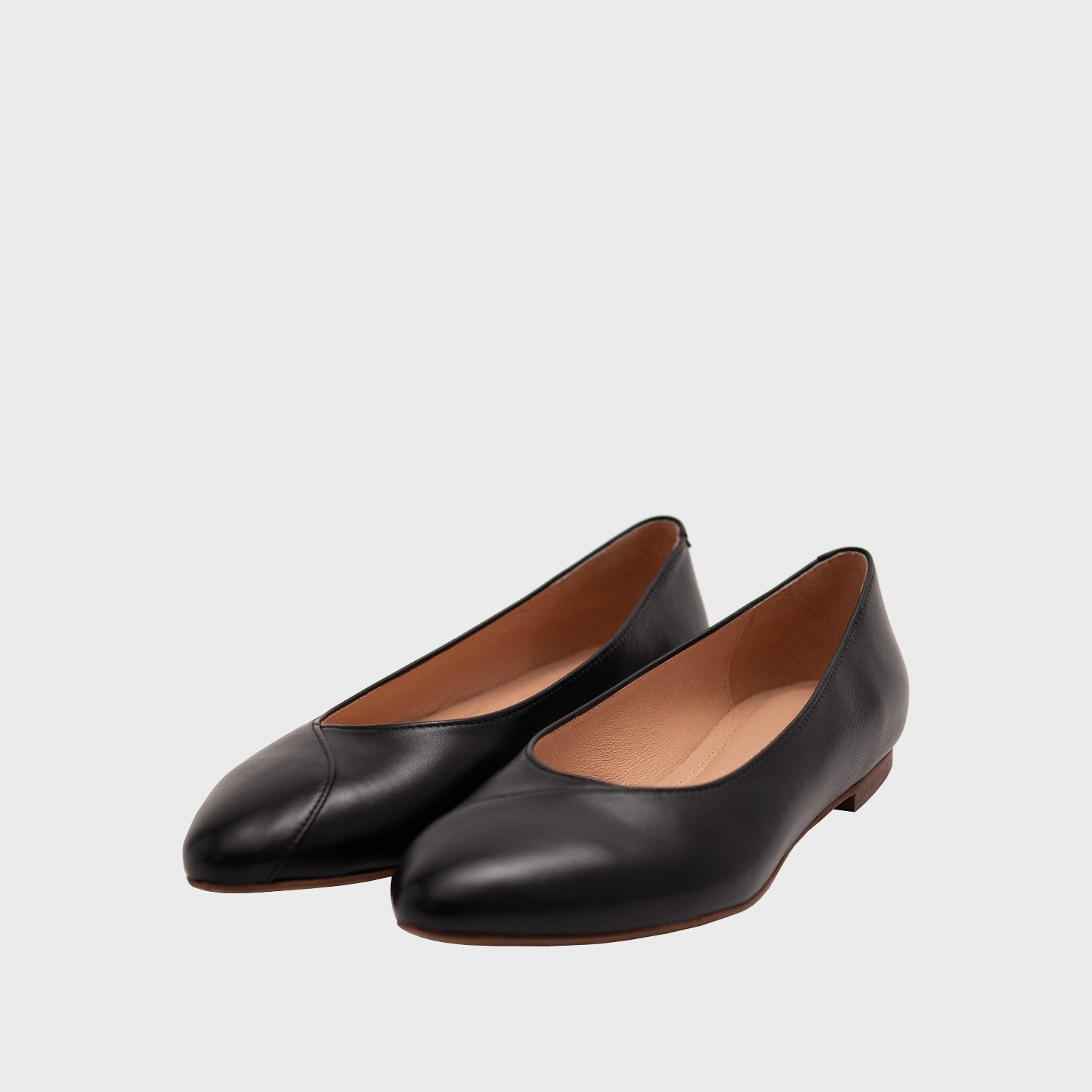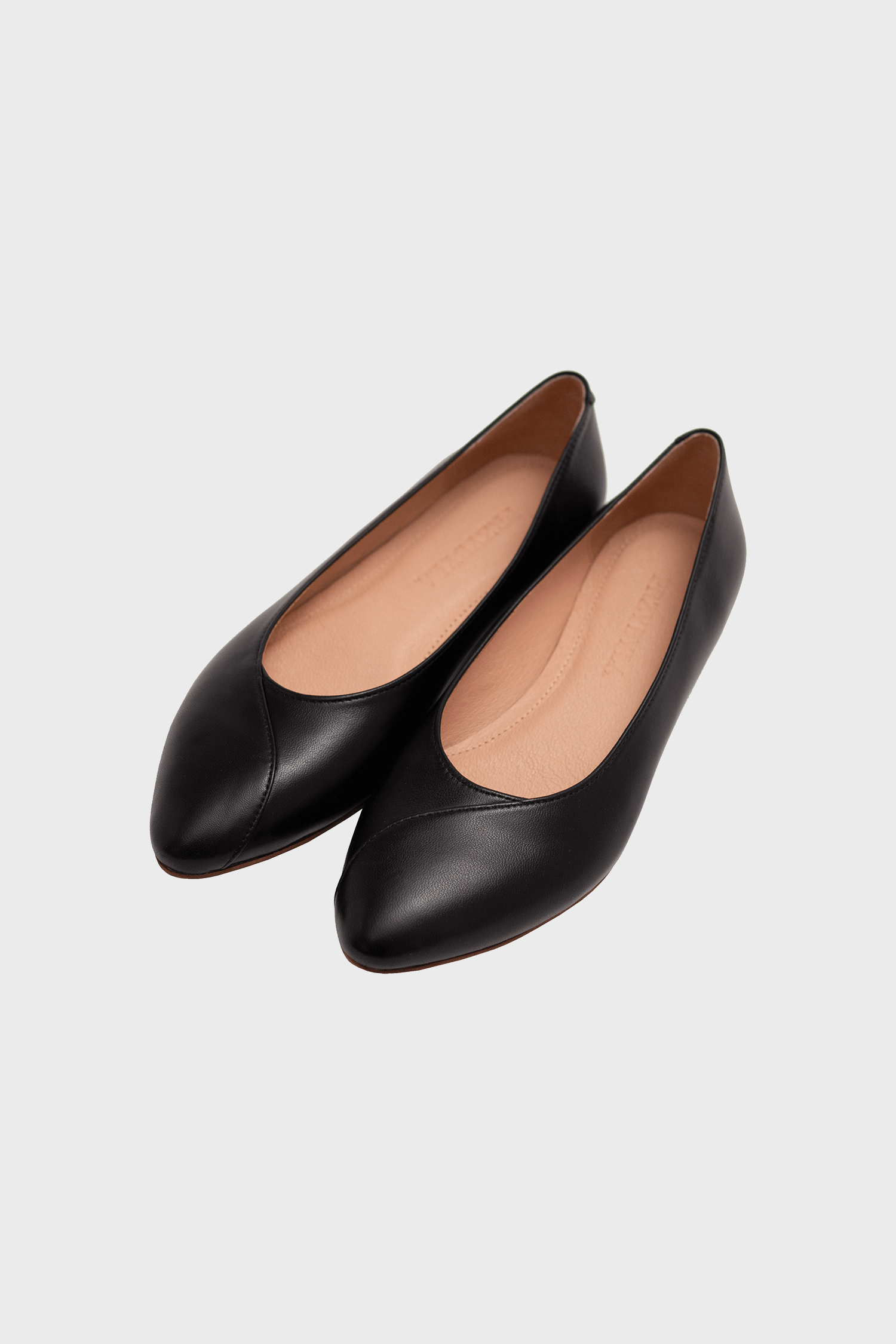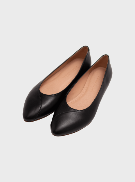Klasyczne, czarne baleriny. Czubek lekko zaokrąglony w kształt migdała (almond shoes). Wykonane zostały ze skóry naturalnej w kolorze czarnym. W środku znajduje się podszewka również ze skóry naturalnej oraz pianka zapewniająca komfort użytkowania.