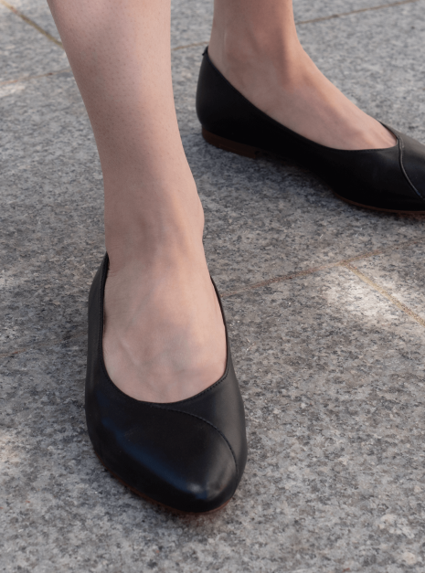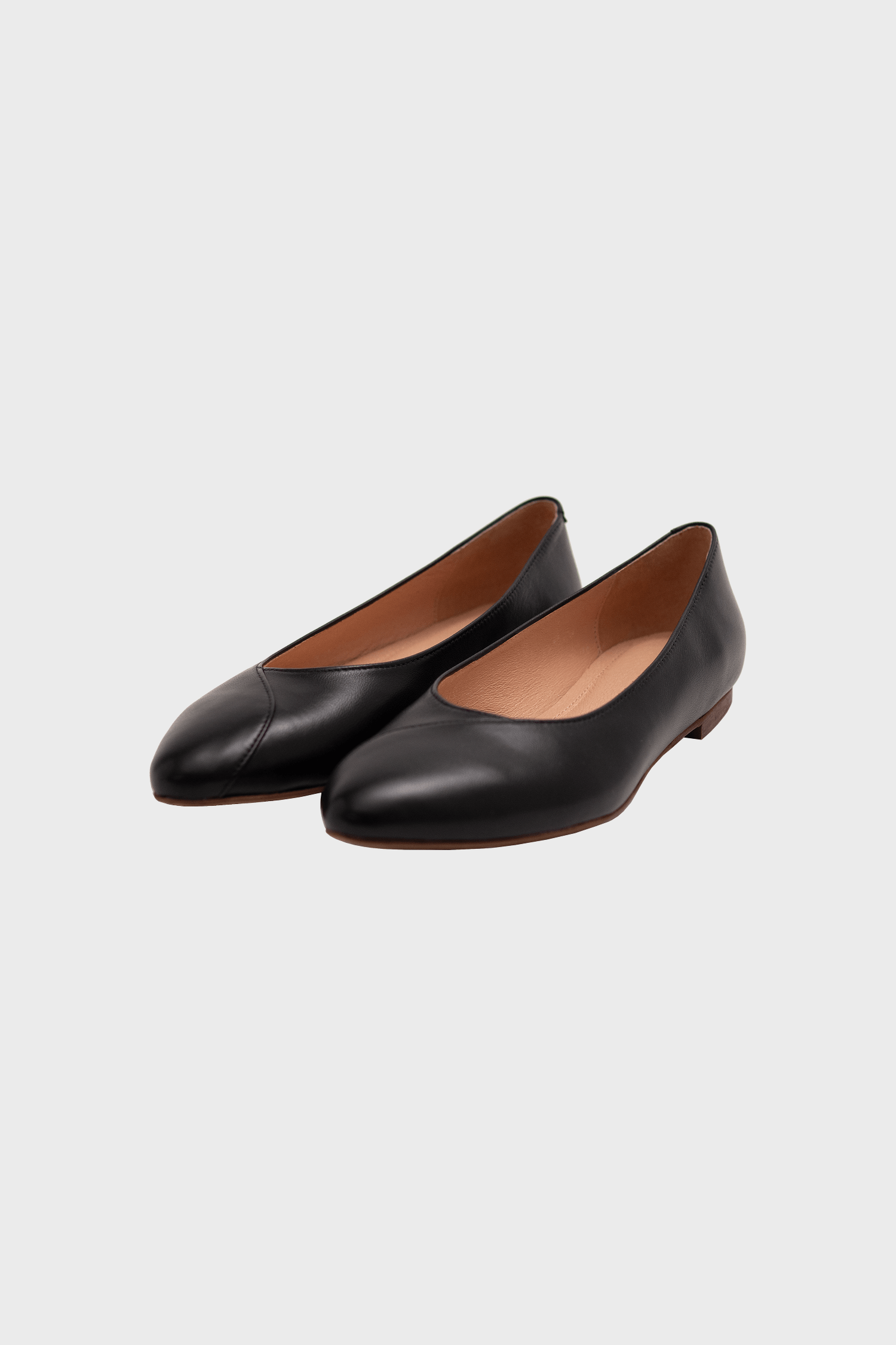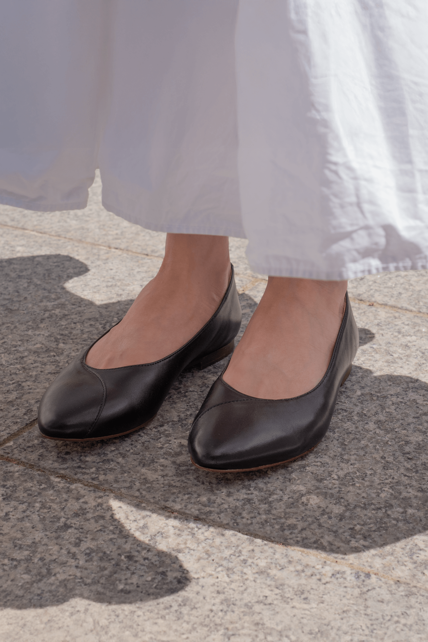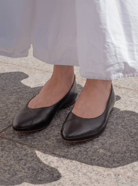 Klasyczne, czarne baleriny. Czubek lekko zaokrąglony w kształt migdała (almond shoes). Wykonane zostały ze skóry naturalnej w kolorze czarnym. W środku znajduje się podszewka również ze skóry naturalnej oraz pianka zapewniająca komfort użytkowania.
