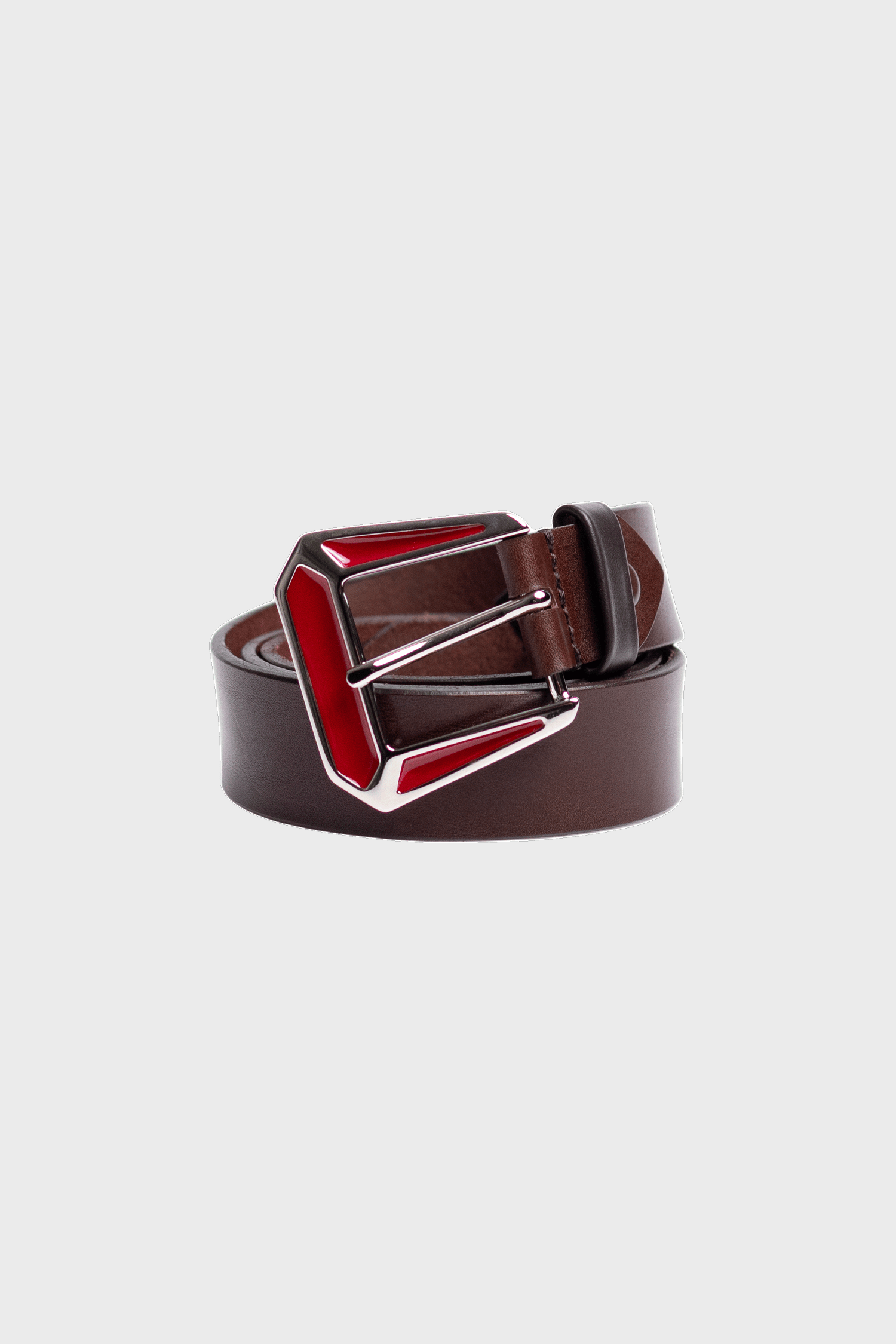 Geometria klamry, podkreślona intensywną czerwienią i srebrnymi akcentami, nawiązuje do estetyki lat 20., stanowiąc główny motyw przewodni kolekcji. Pasek wykonano z wysokiej jakości, gładkiej brązowej skóry, dzięki czemu jest nie tylko efektowny, ale także trwały i wygodny w noszeniu.