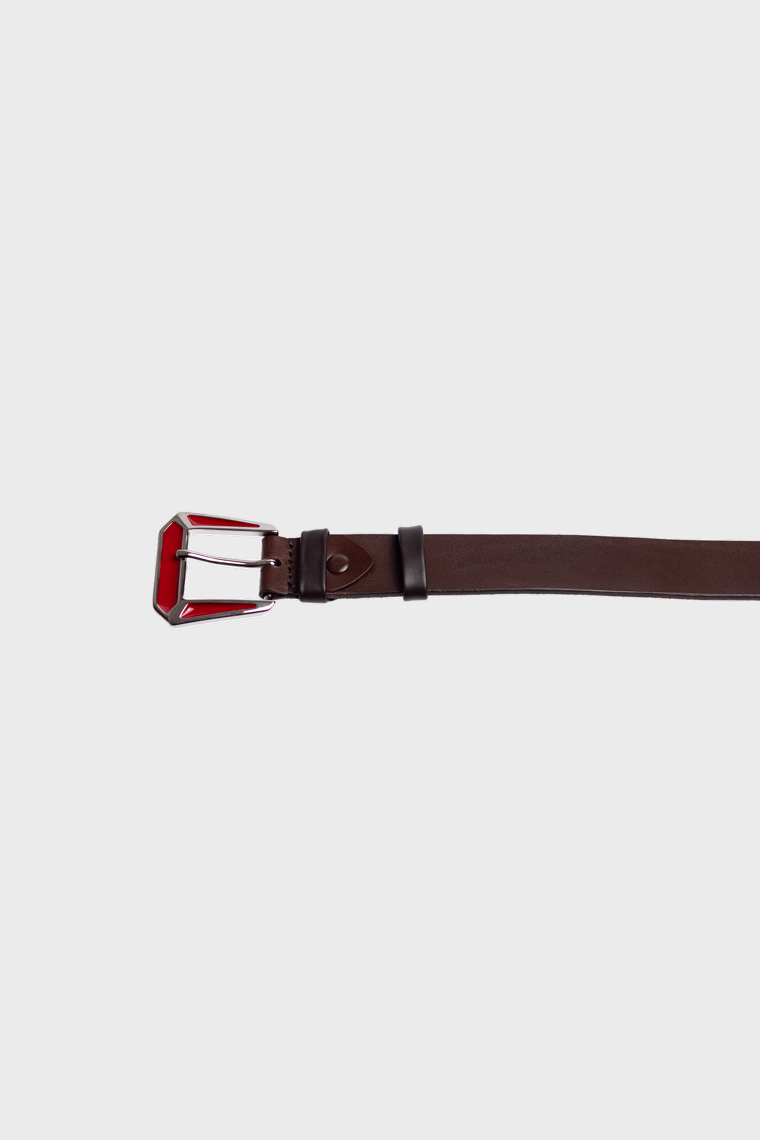 Klamra srebrna z czerwoną emalią, skóra naturalna w kolorze brązowym