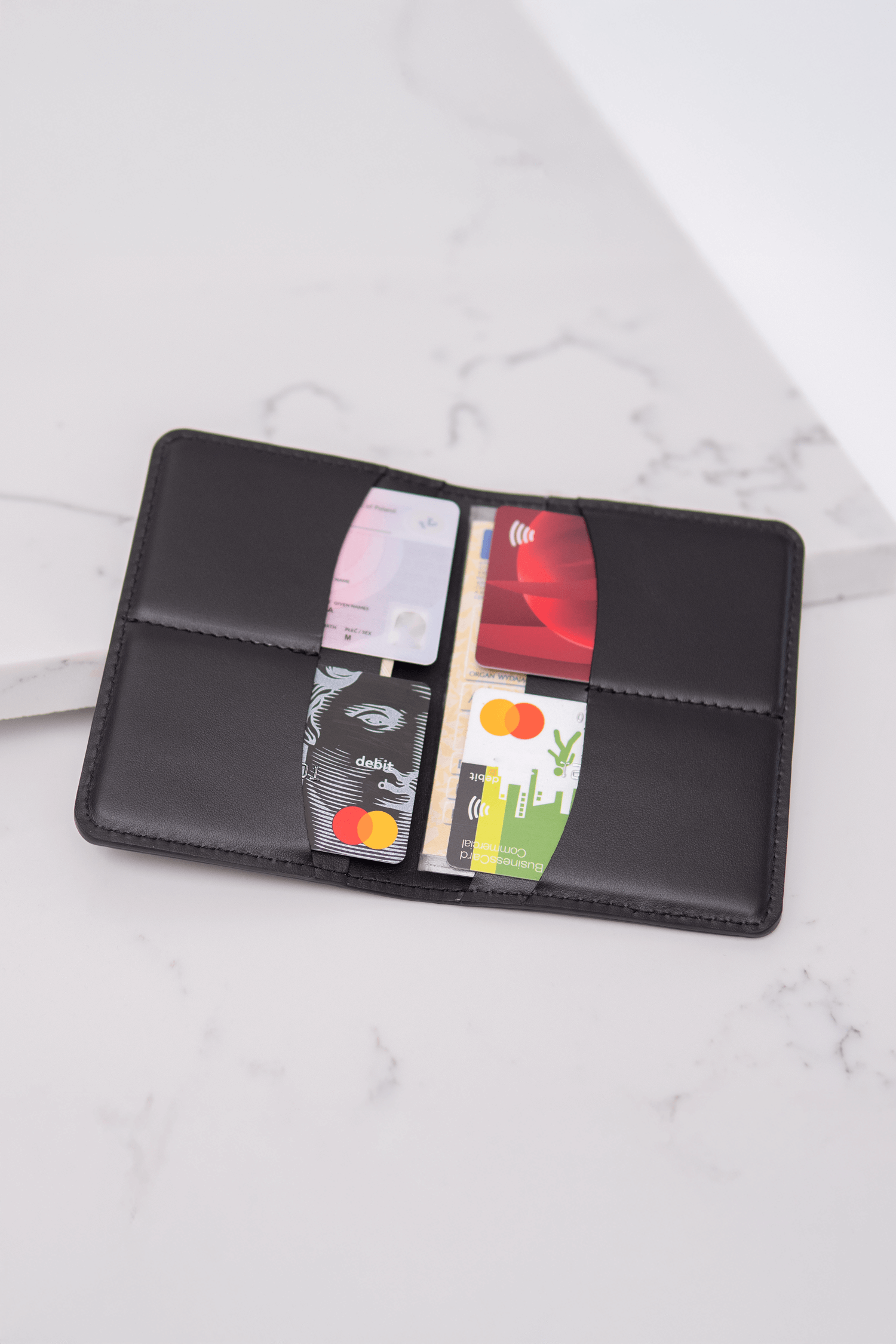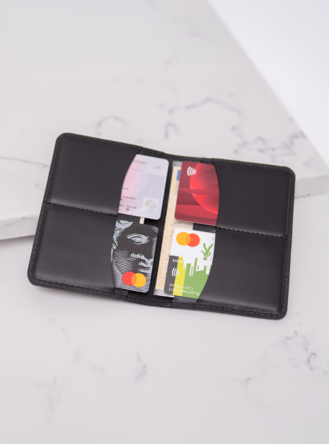 Portfel posiada liczne kieszonki na karty i przegródki. Są w nim 4 kieszonki na karty oraz dwie przegródki na większe dokumenty, np. dowód rejestracyjny i złożone banknoty. Portfel mieści się w kieszeni marynarki, nie wypycha kieszeni.