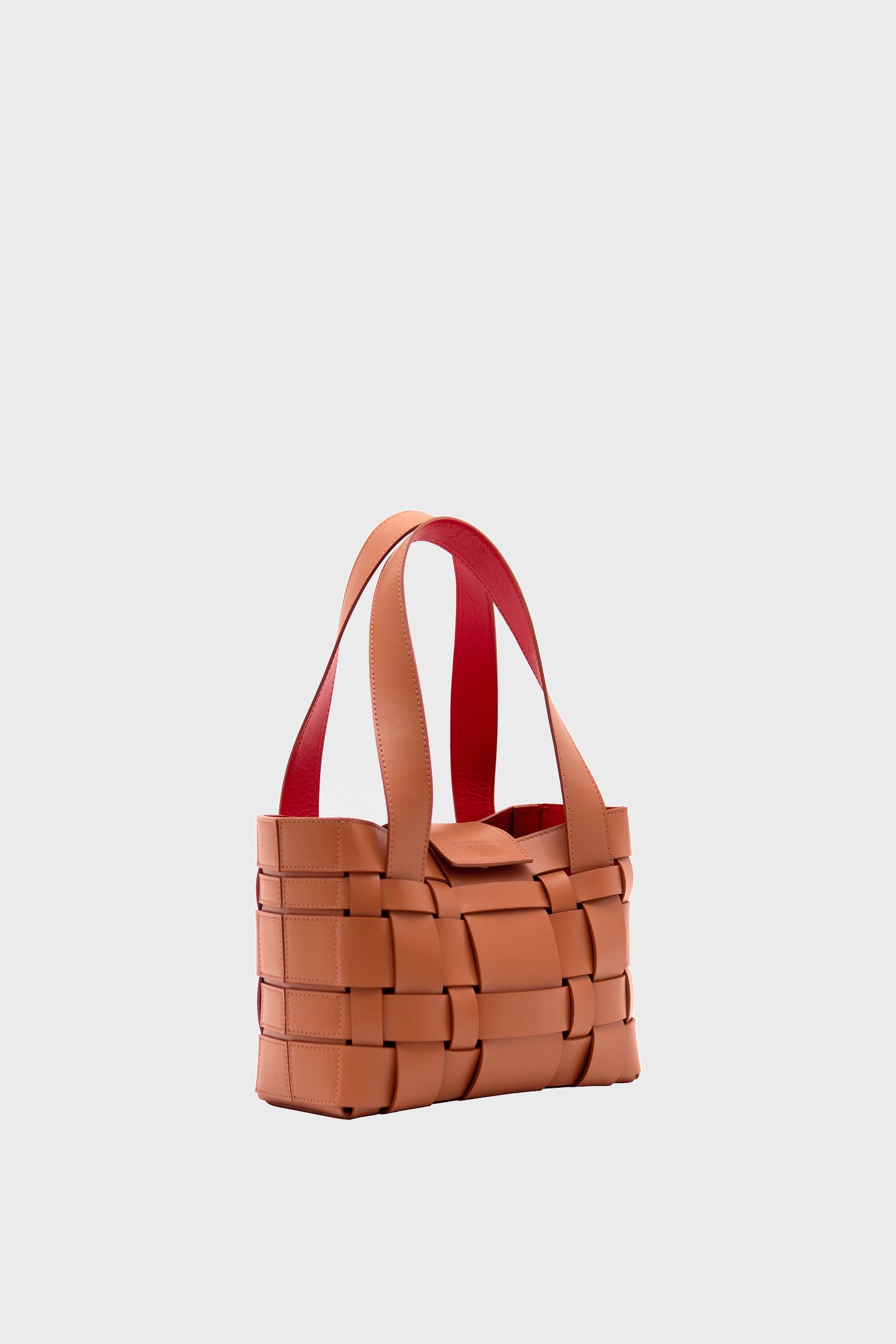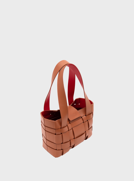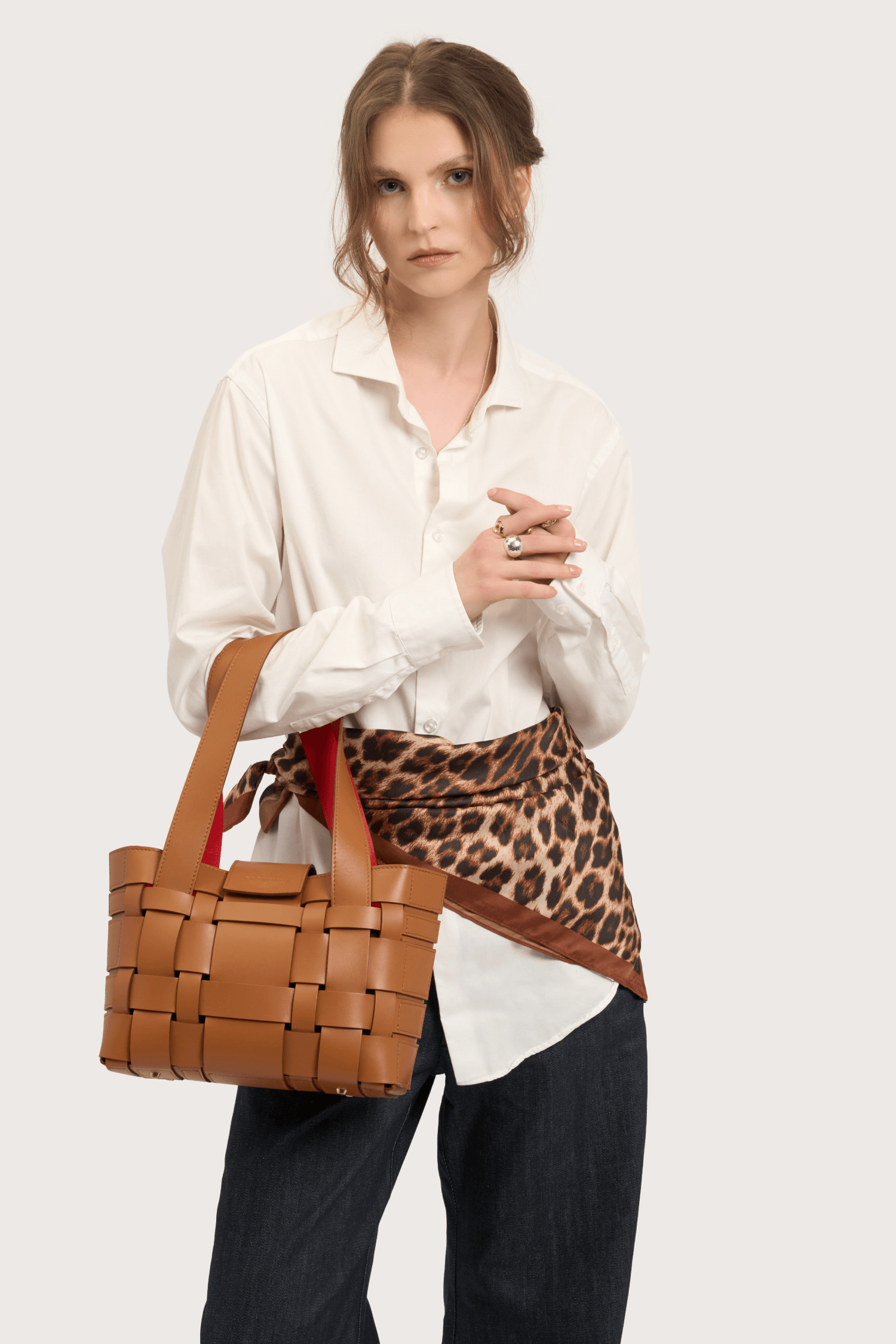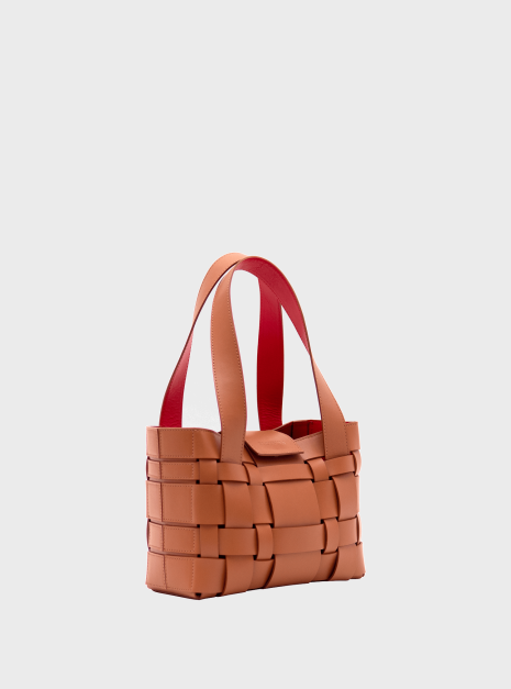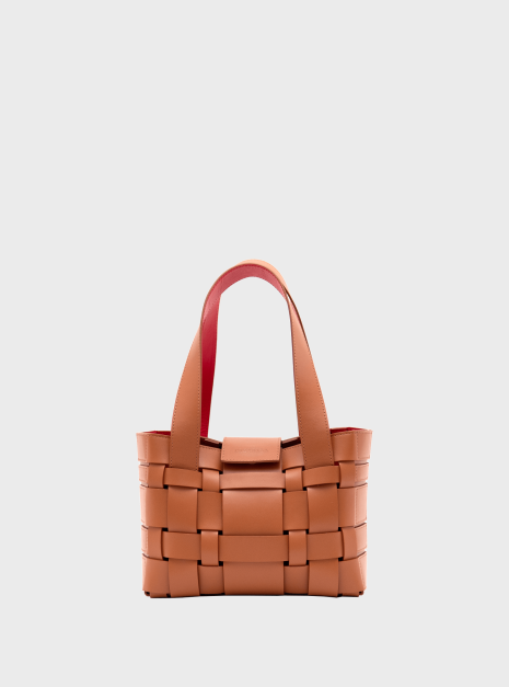 Torba z kolekcji XY w kolorze koniakowym i skórzaną podszewką w kolorze czerwonym. Jest to najmniejsza torba w kolekcji mieszcząca format A5. Fason torby odpowiada na codzienne potrzeby użytkownika. Jej wyjątkowe zapięcie, stanowiące bazowy element konstrukcji, nadaje wyjątkowy charakter.