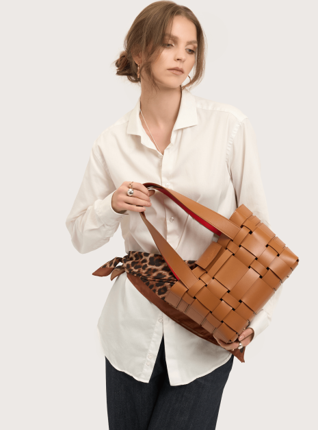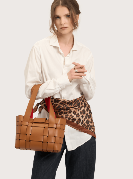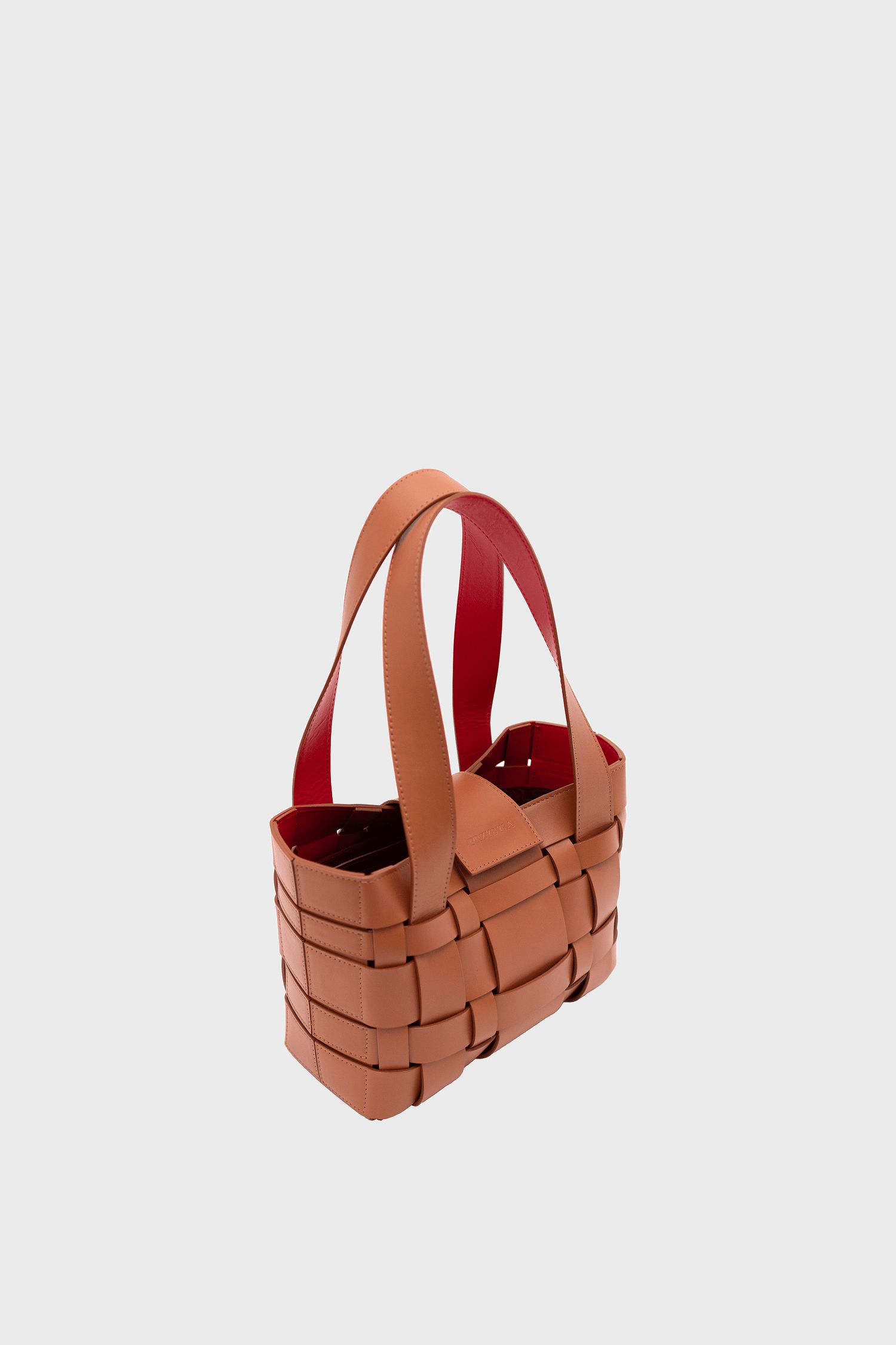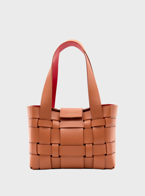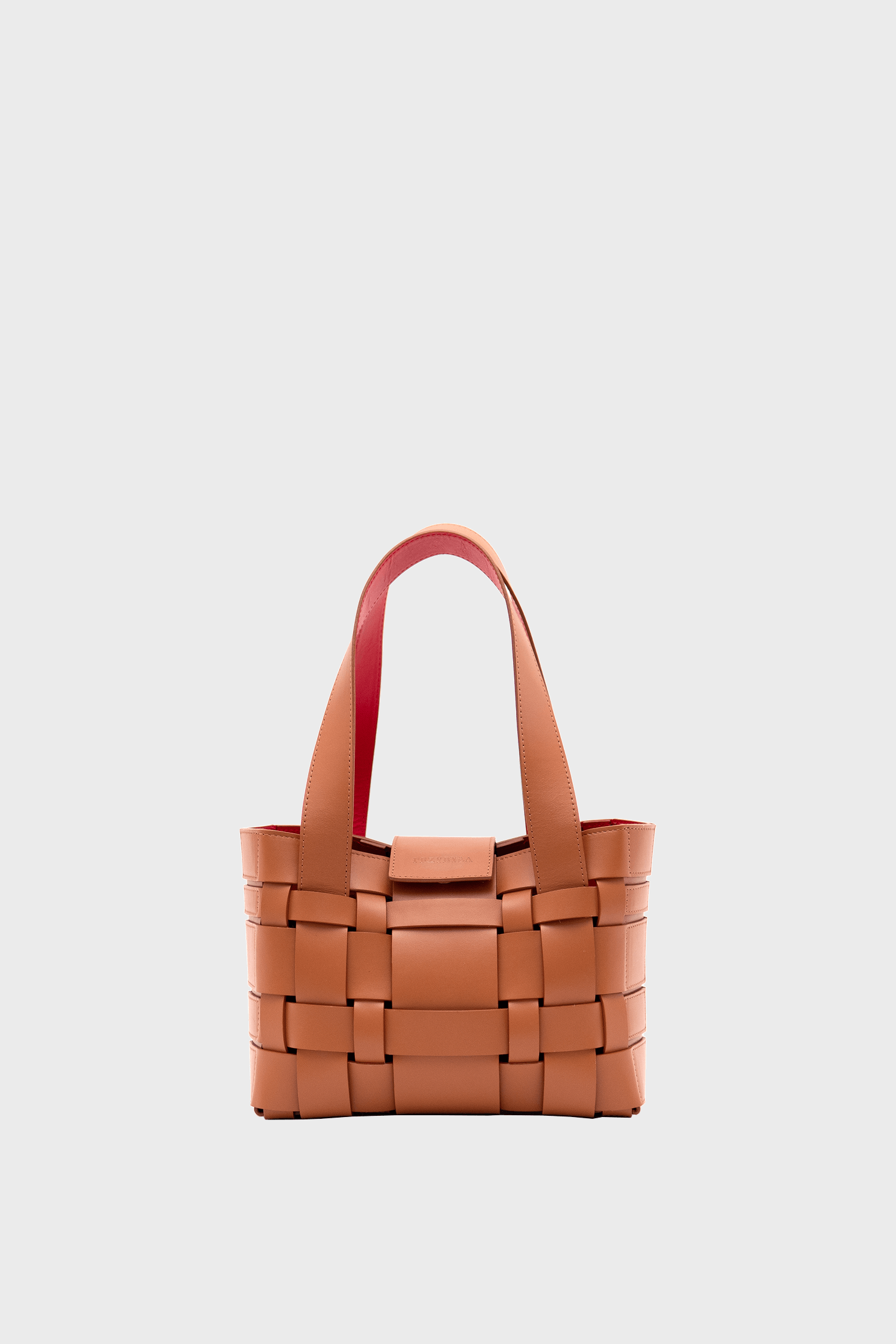 Torba z kolekcji XY w kolorze koniakowym i skórzaną podszewką w kolorze czerwonym. Jest to najmniejsza torba w kolekcji mieszcząca format A5. Fason torby odpowiada na codzienne potrzeby użytkownika. Jej wyjątkowe zapięcie, stanowiące bazowy element konstrukcji, nadaje wyjątkowy charakter.