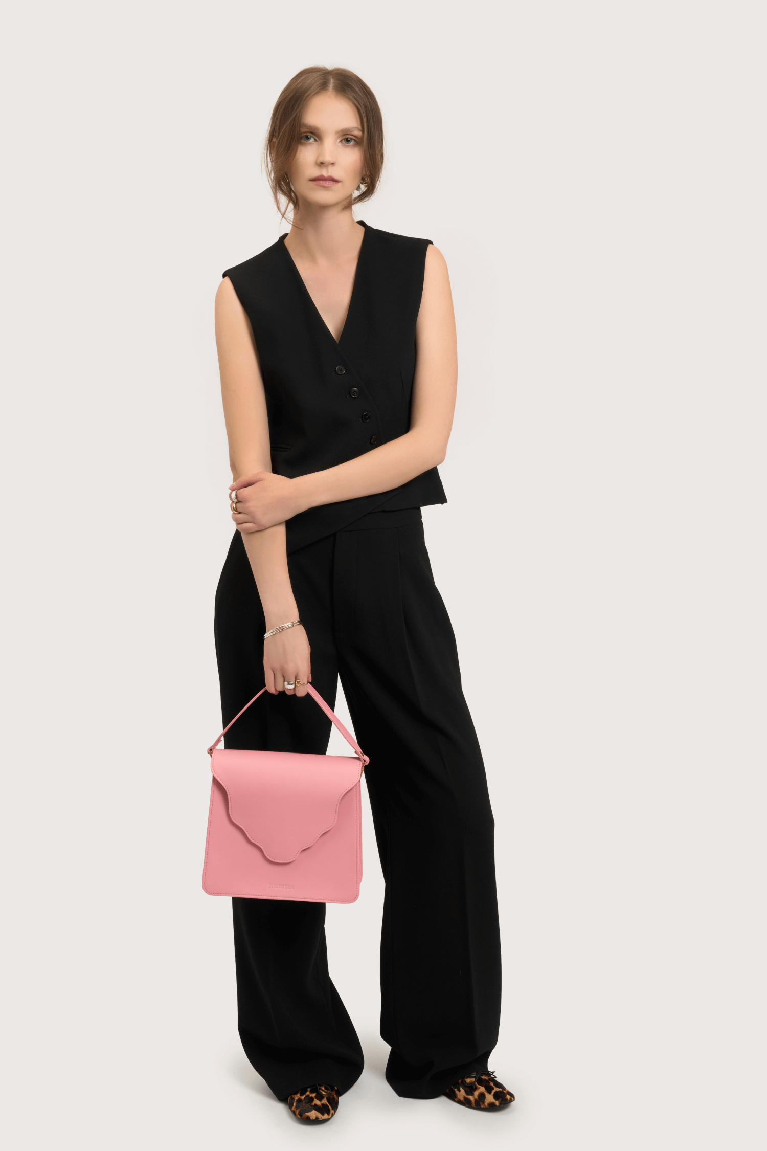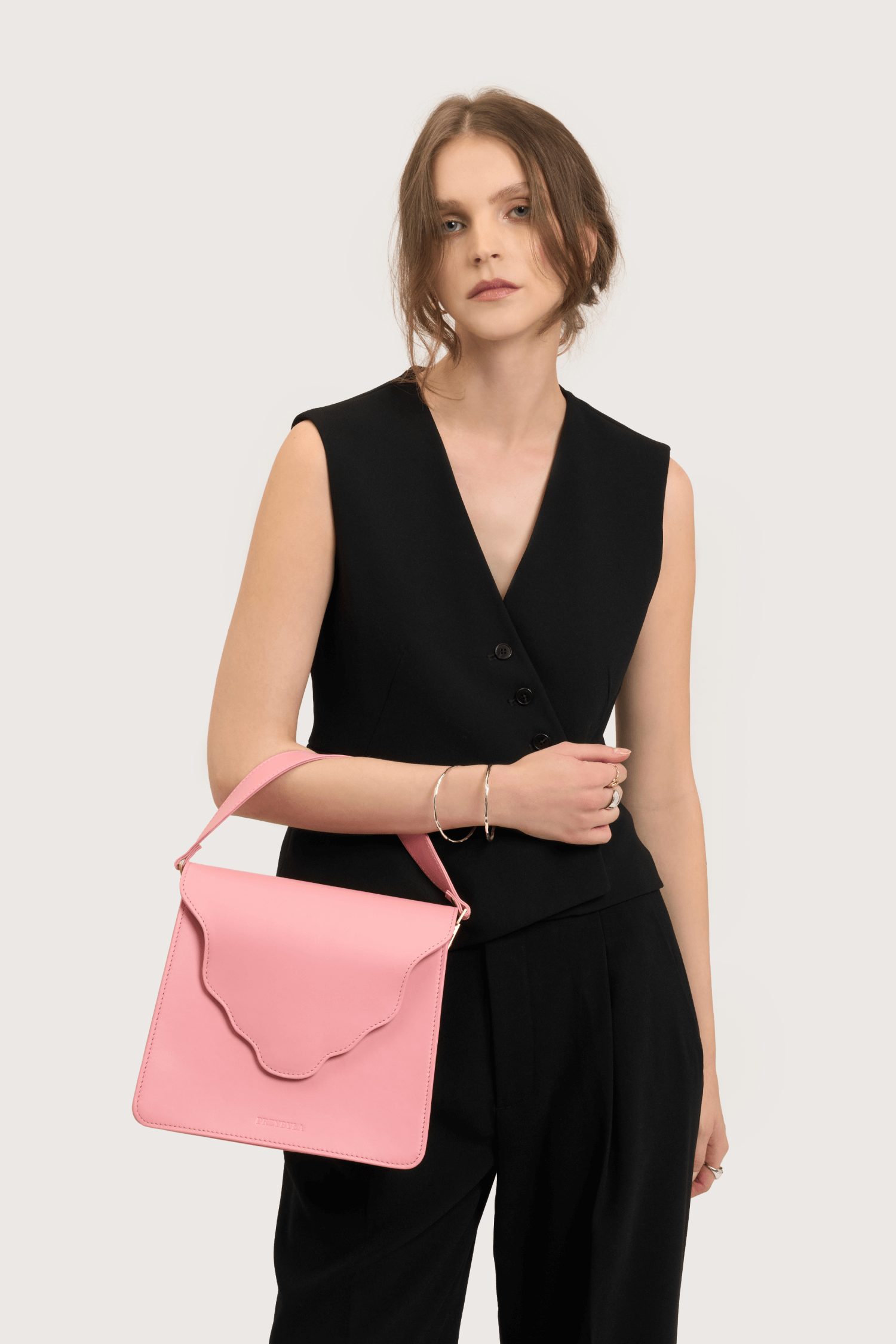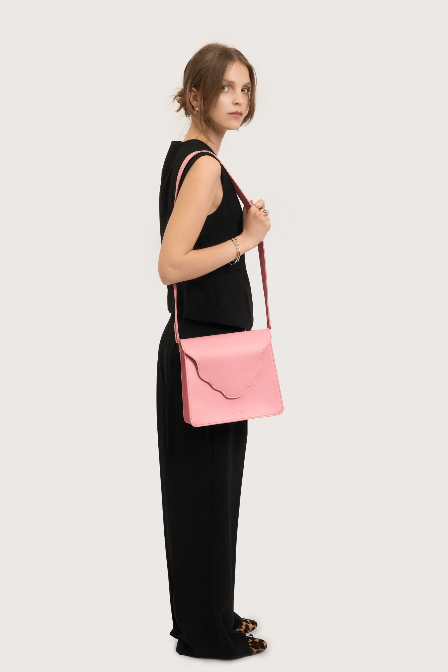 Torebka ARC MIDI to powiększony model Torebki ARC . Torebka został wykonana z naturalnej skóry licowej w kolorze pudrowo różowym. Podszewka jest wykonana z bawełnianej tkaniny w kolorze bordowym.