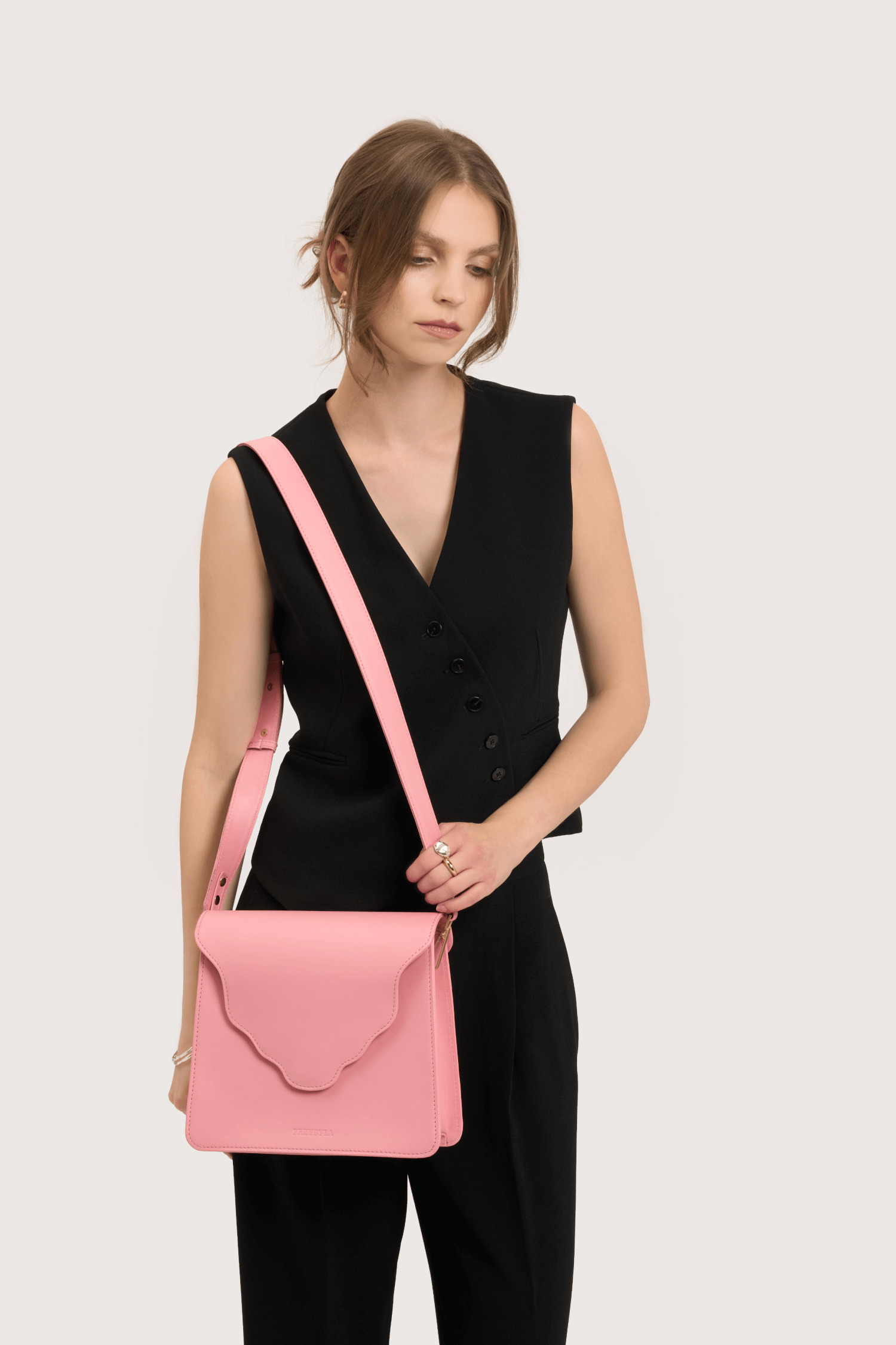 Posiada długi regulowany pasek (od 93 cm do 109 cm). Sprawdzi się w codziennych stylizacjach. Krótka rączka nada torebce bardziej oficjalny charakter. Obie rączki są w zestawie.