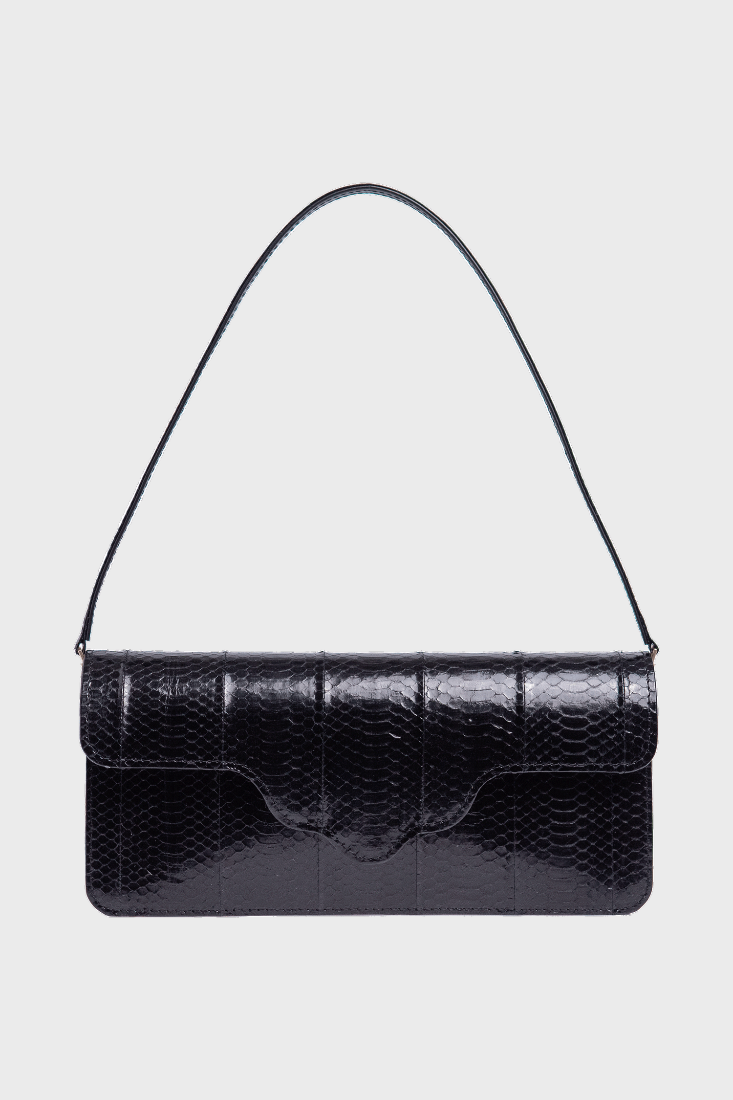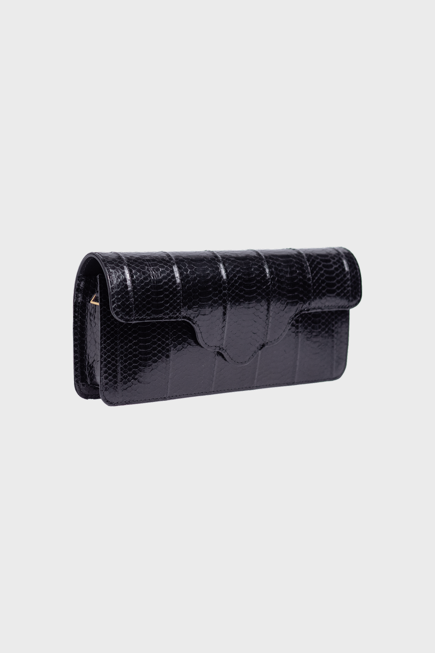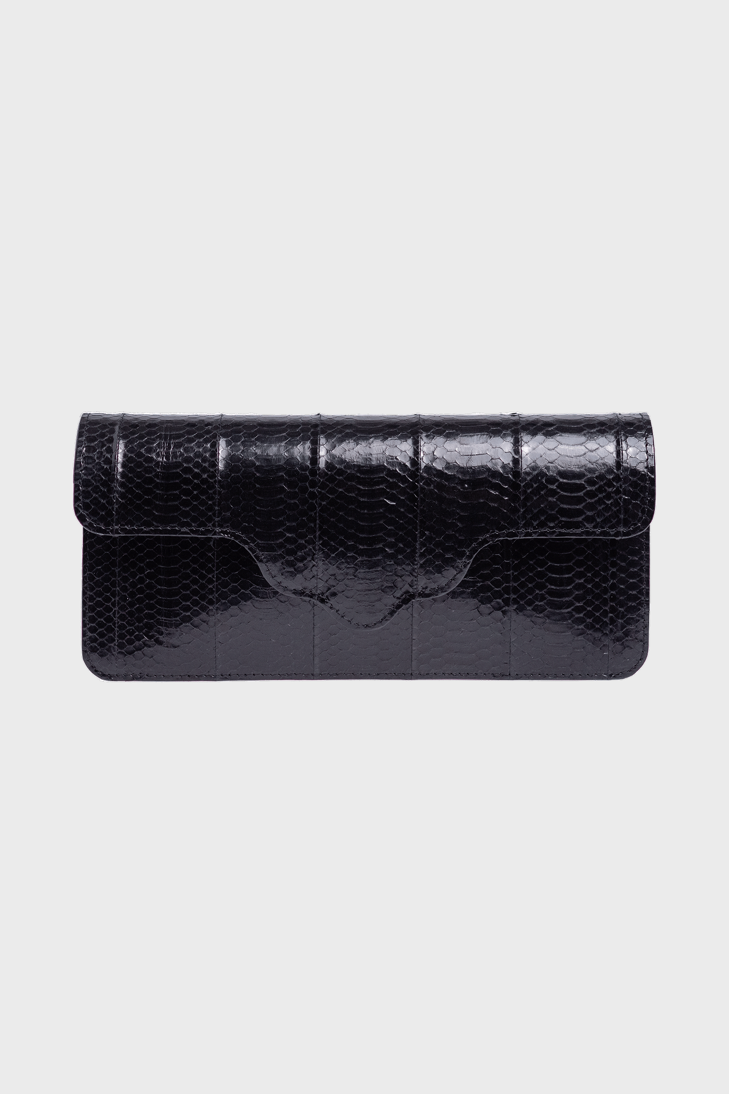 Torebka ARC MINI LONG, wykonaną ze skóry węża Xenopeltis (gatunek niepodlegający CITES) w kolorze czarnym z delikatnym połyskiem. Torebka ARC MINI LONG to wydłużona wersja ARC MINI.