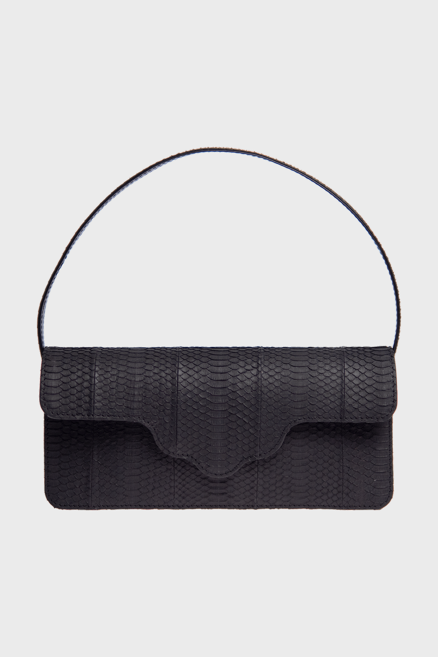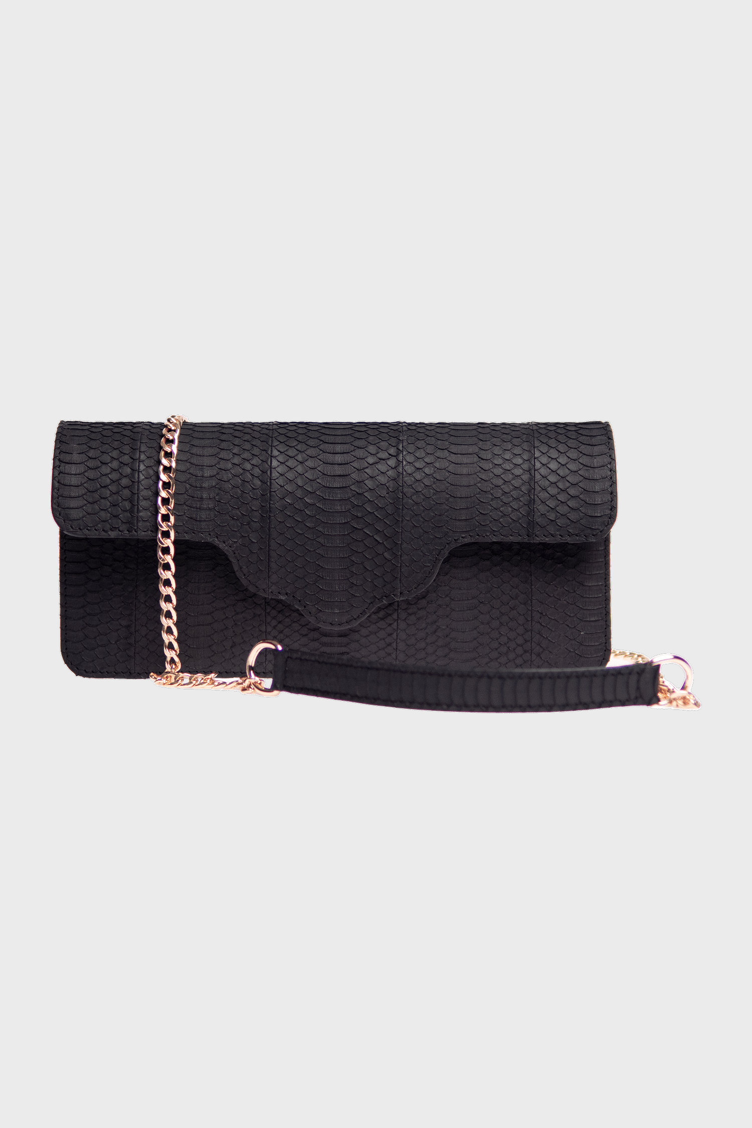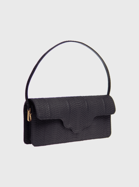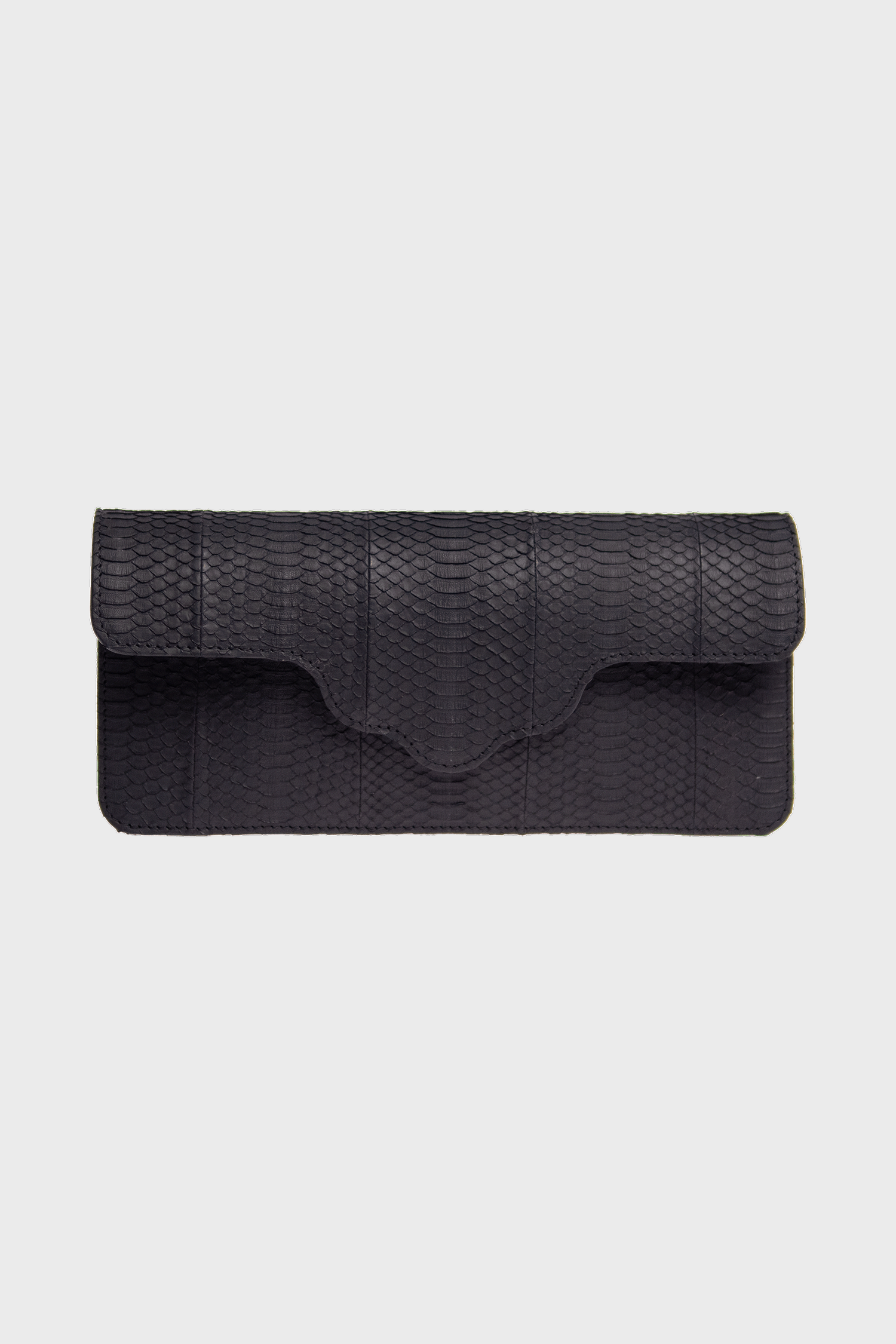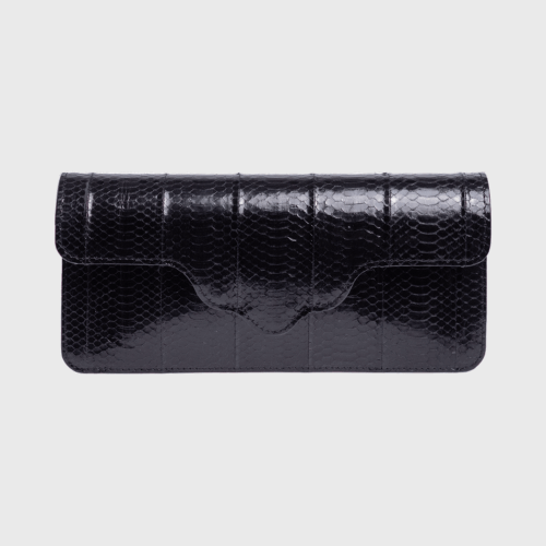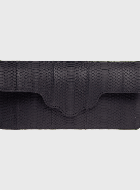 Torebka ARC MINI LONG, wykonaną ze skóry węża Xenopeltis (gatunek niepodlegający CITES) w kolorze czarnym matowym. Torebka ARC MINI LONG to wydłużona wersja ARC MINI.