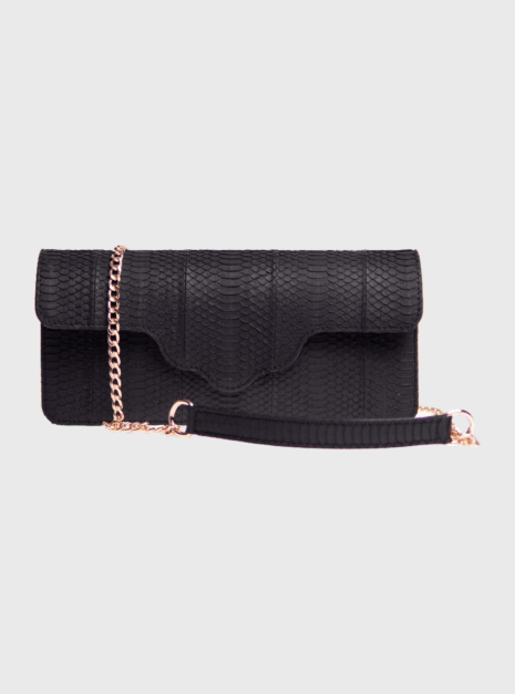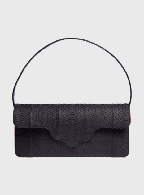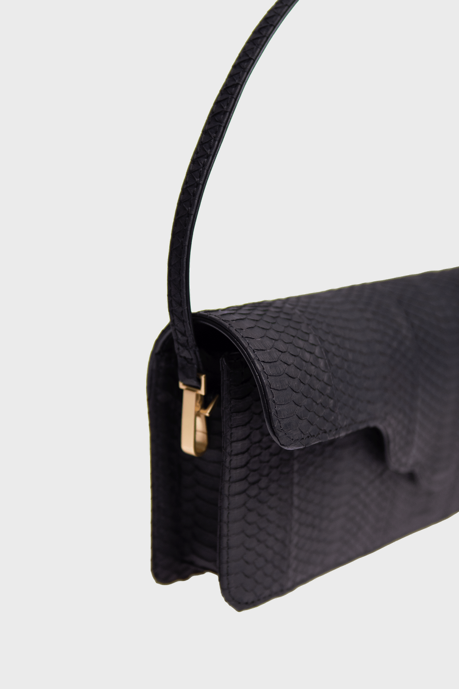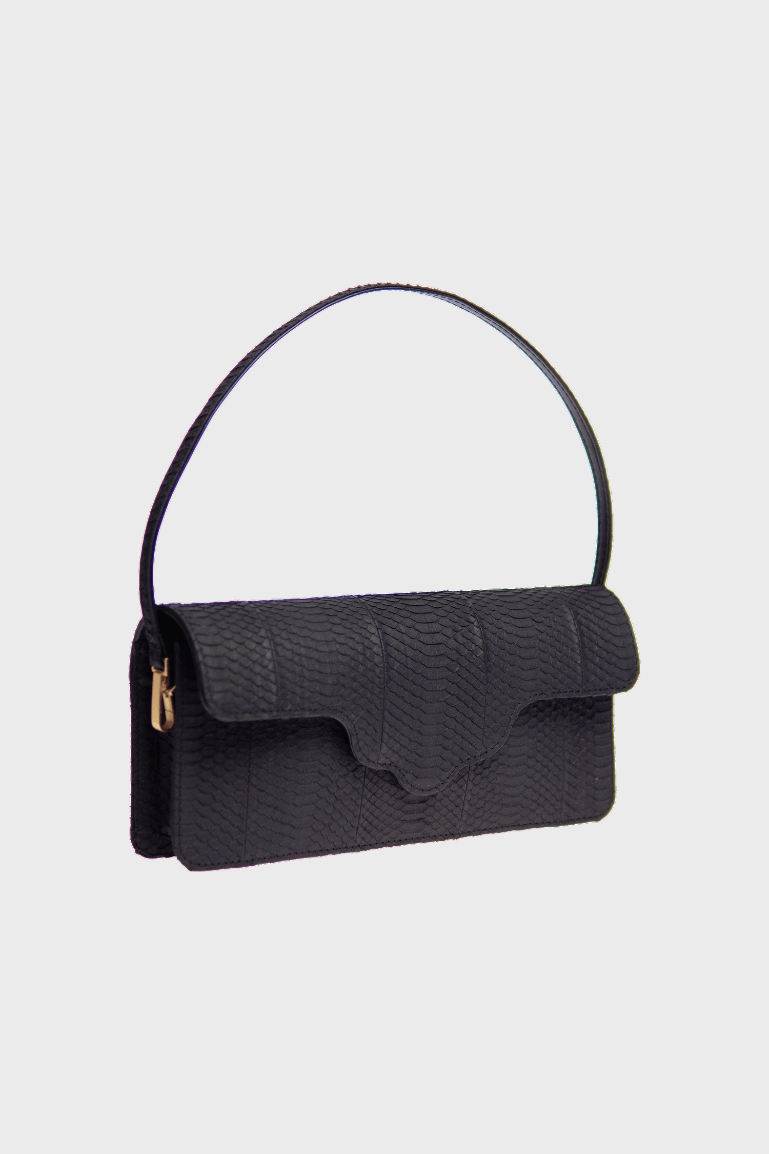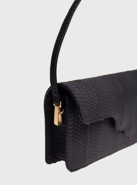 Torebka ARC MINI LONG, wykonaną ze skóry węża Xenopeltis (gatunek niepodlegający CITES) w kolorze czarnym matowym. Torebka ARC MINI LONG to wydłużona wersja ARC MINI.