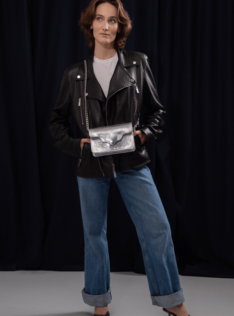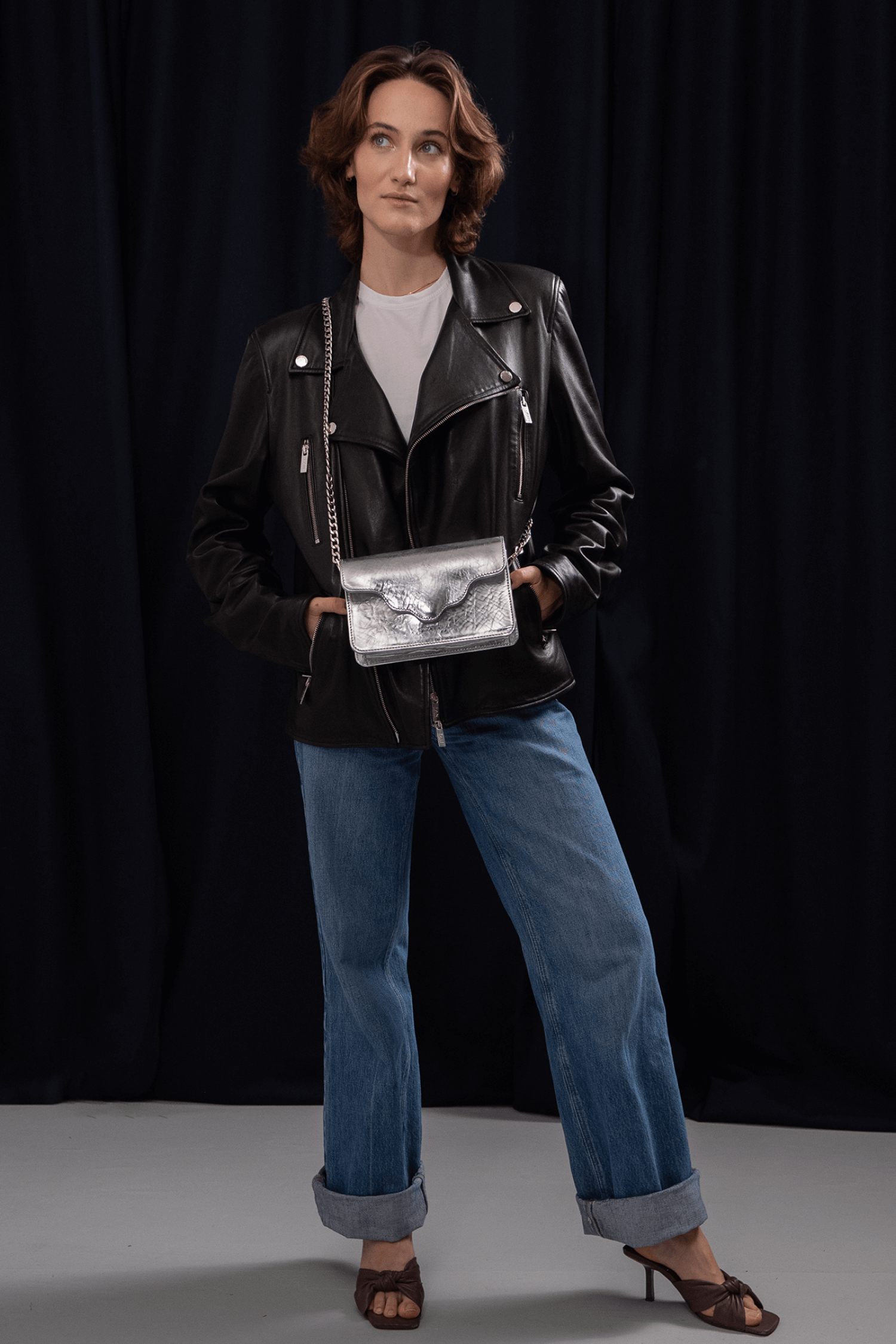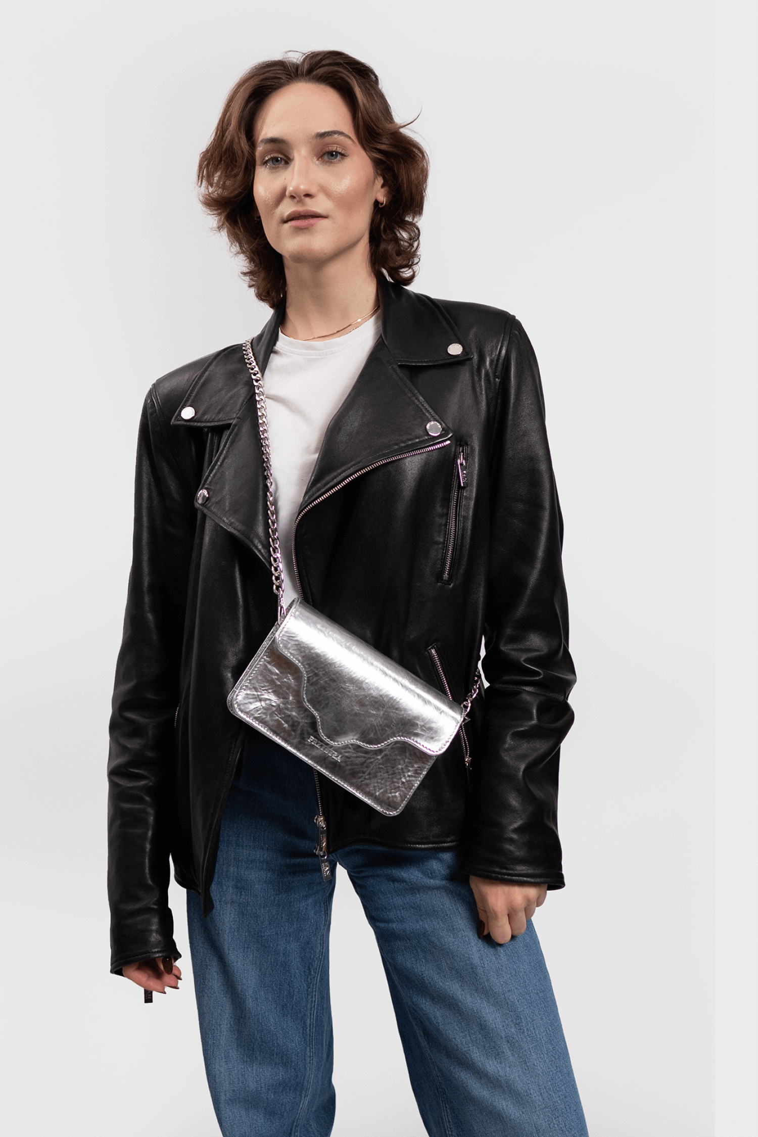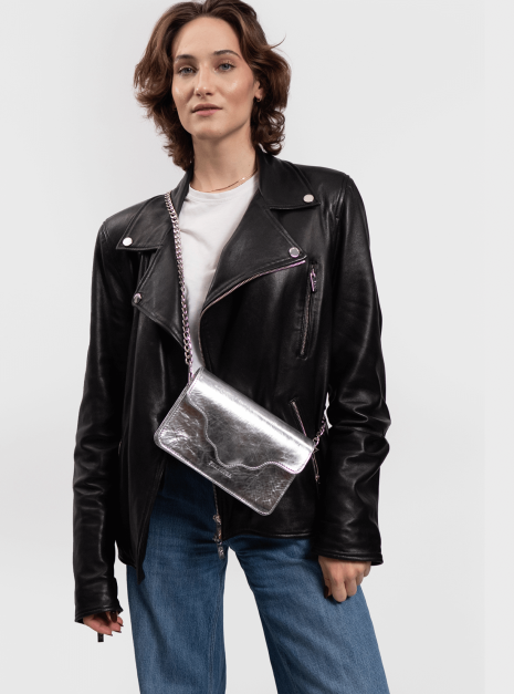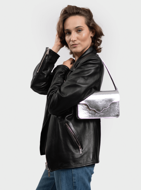 Torebka ARC MINI, wykonaną ze skóry strukturalnej w kolorze srebrnym. Skóra jest ręcznie przygotowywana, by nabrała indywidualnej struktury. Ten wzór na skórze to zapowiedź trendów i rozwiązań na najbliższe sezony.