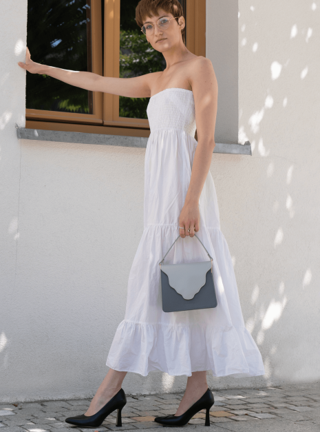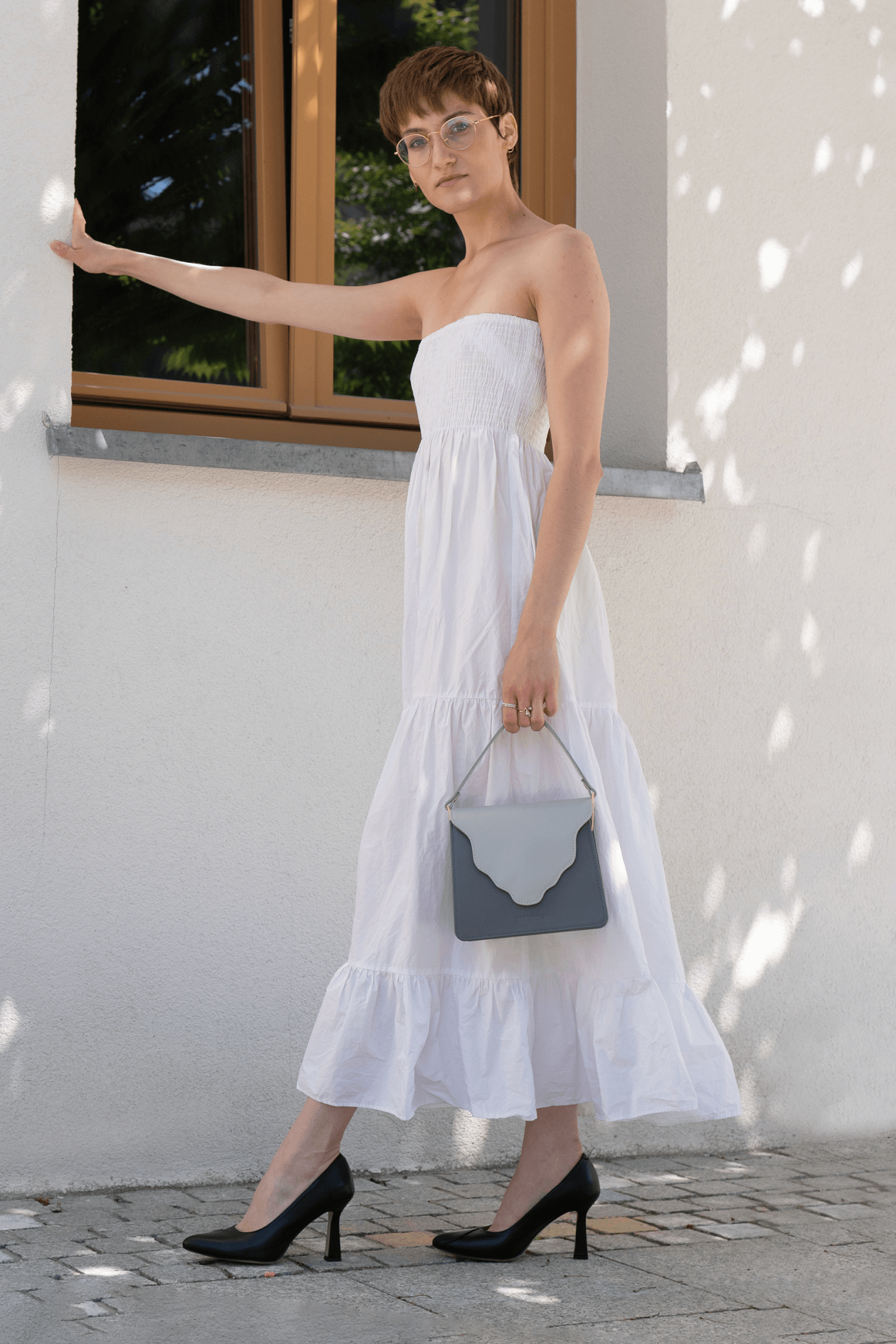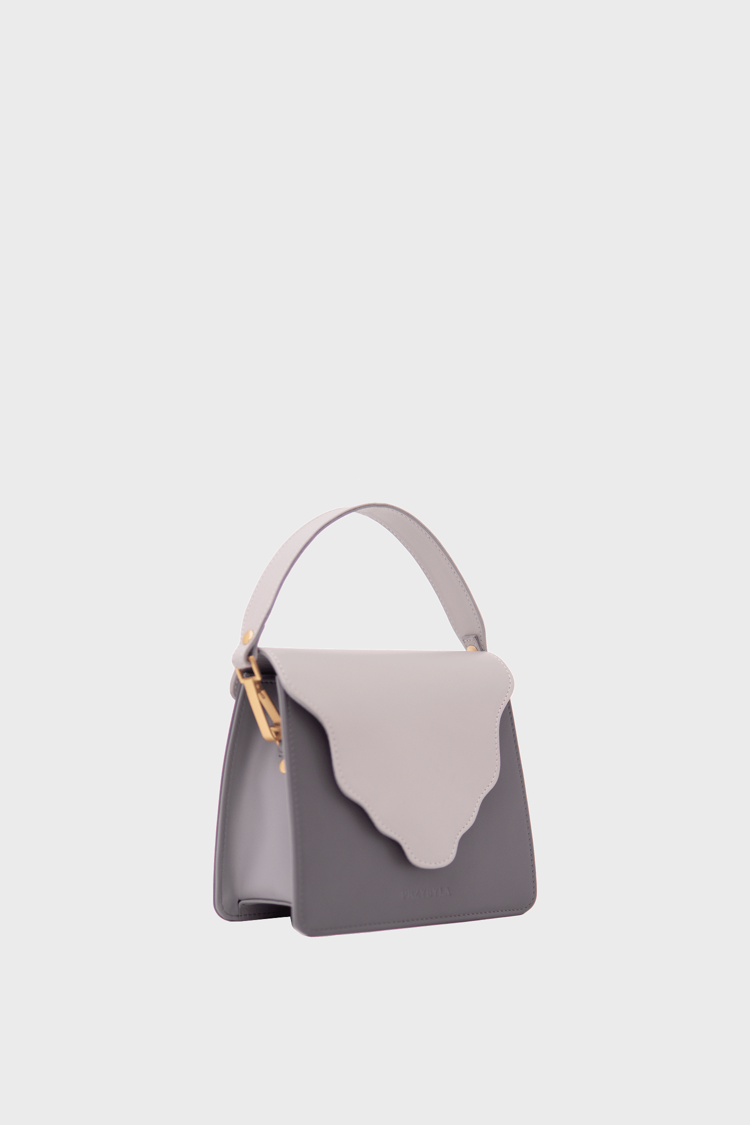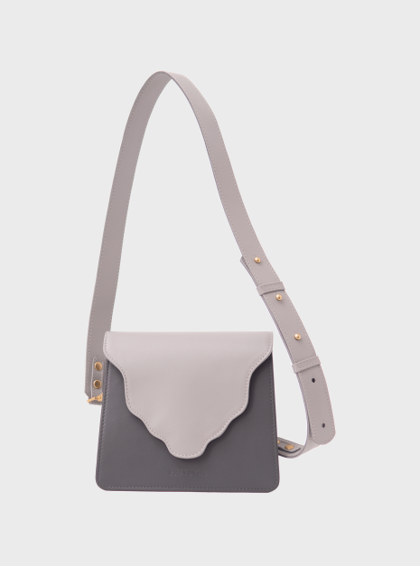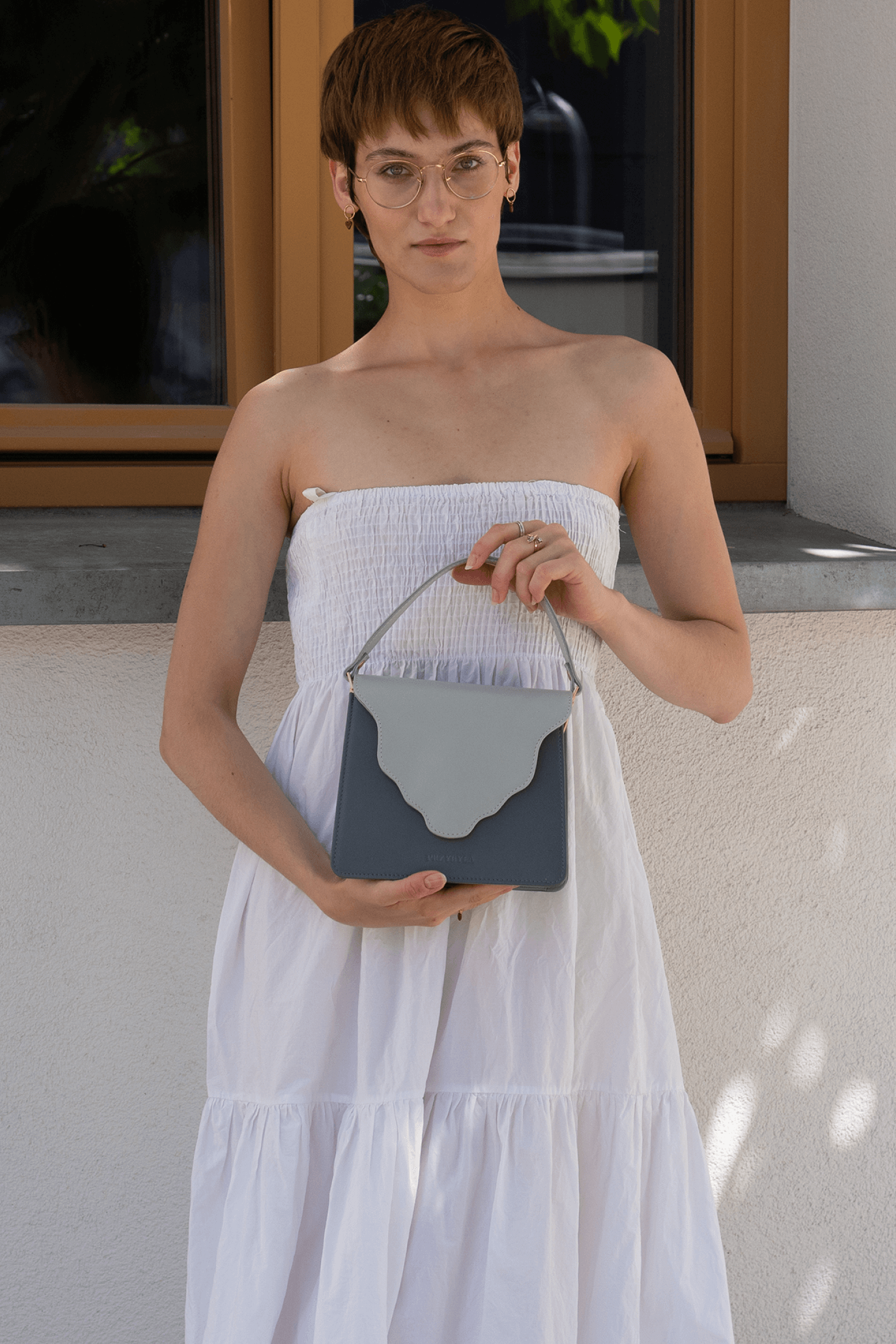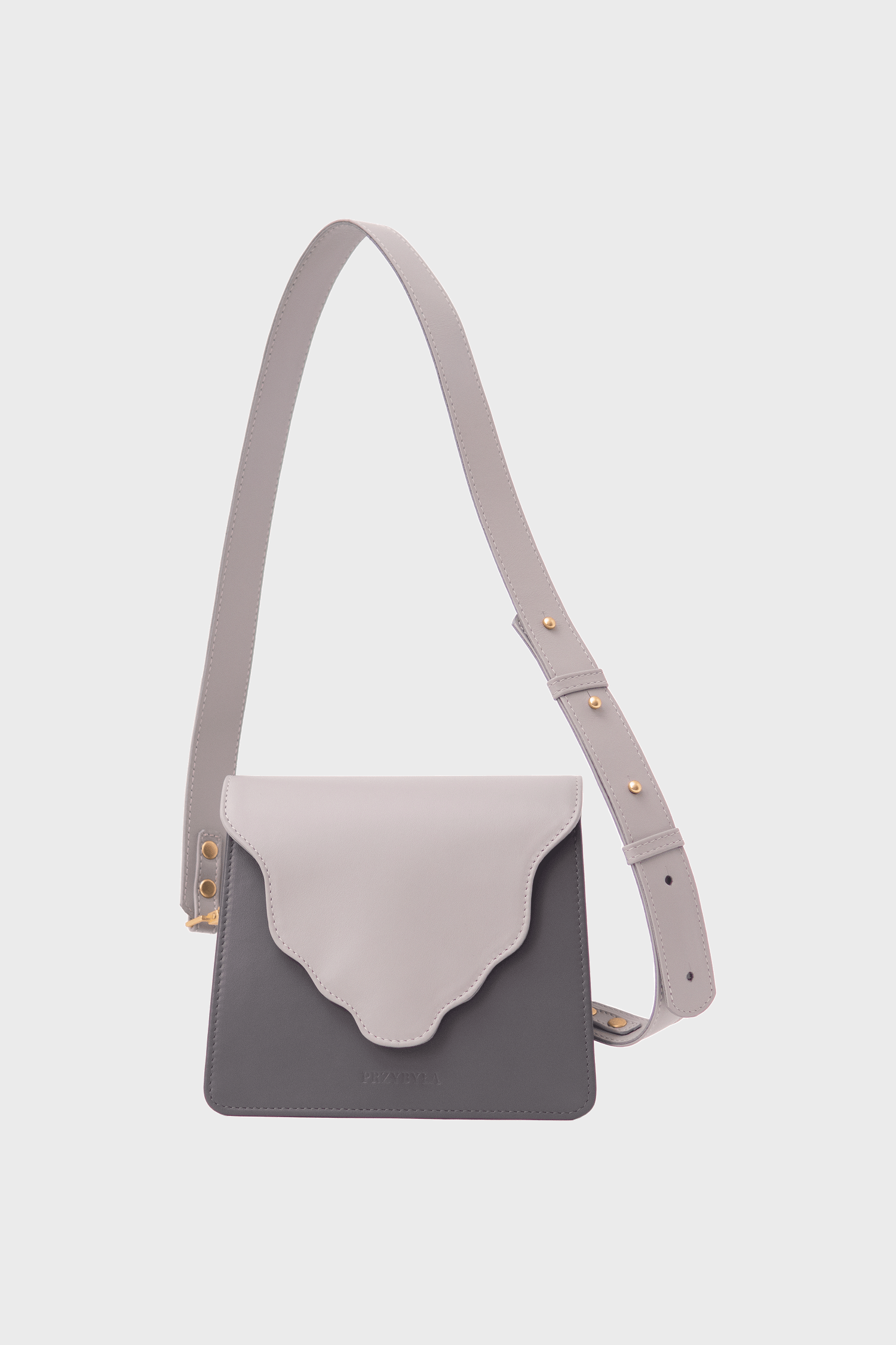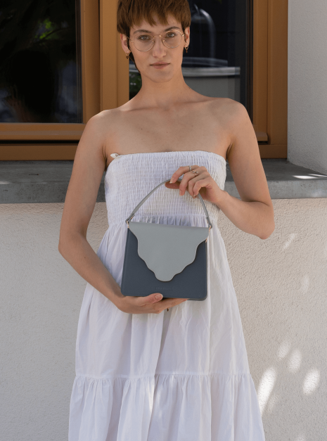 Torebka ARC tricolor gray została wykonana z naturalnej skóry licowej w trzech odcieniach. Podszewka jest wykonana z bawełnianej tkaniny w kolorze jasnoszarym.