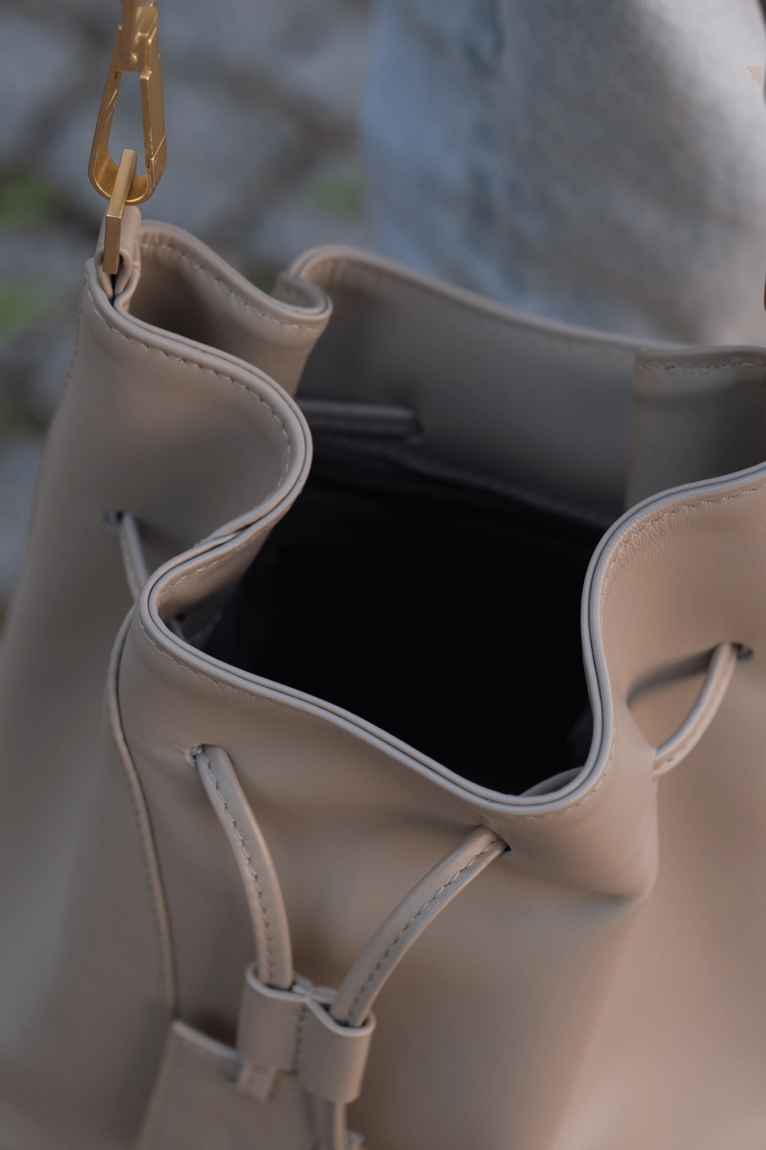 Worek wykończony jest okuciami w kolorze perłowego złota.